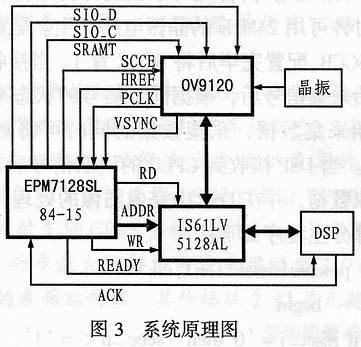 在本系統(tǒng)中,OV9120作為系統(tǒng)的圖像傳感器,首先在其內(nèi)部將獲取的圖像采樣量化,然后在外部邏輯的控制下輸出數(shù)字圖像,并存入圖像存儲(chǔ)器。CPLD作為采集系統(tǒng)核心控制邏輯的主控模塊,可用來(lái)協(xié)調(diào)其它各模塊的工作。OV9120的SCCB總線參數(shù)配置是整個(gè)控制邏輯模塊執(zhí)行的起點(diǎn),只有利用SCCB總線將OV9120配置完畢后,才能進(jìn)行圖像采集工作。OV9120采集得到的圖像數(shù)據(jù)可存儲(chǔ)到SRAM中以供DSP使用,從而完成圖像采集系統(tǒng)與DSP識(shí)別系統(tǒng)之間的交互操作。其系統(tǒng)原理圖如圖3所示。