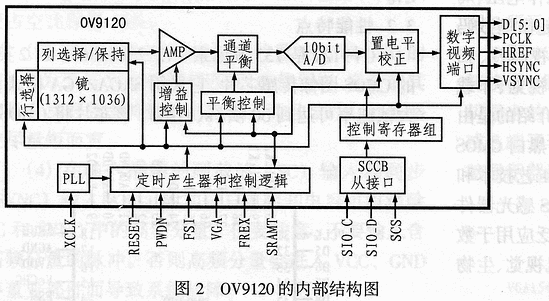 OV9120內(nèi)置1312×1036分辨率的鏡像陣列、10位A/D轉(zhuǎn)換器、可調(diào)視頻窗、SCCE接口、可編程幀速率控制、可編程/自動(dòng)曝光增益控制、內(nèi)外幀同步、亮度均衡計(jì)數(shù)器、數(shù)字視頻端口、定時(shí)產(chǎn)生器、黑電平校準(zhǔn)及白平衡控制等電路。其內(nèi)部結(jié)構(gòu)如圖2所示。