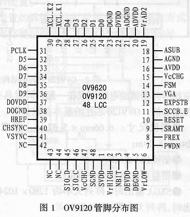 OV9120采用48腳LCC封裝,其引腳排列如圖1所示。