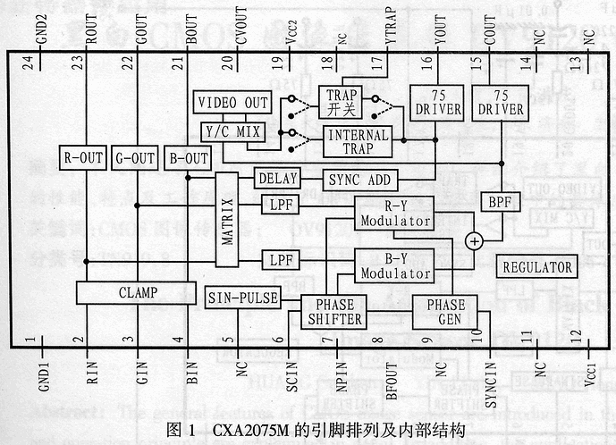 CXA2075M是SONY公司生產(chǎn)的視頻解碼芯片。它可將模擬RGB信號轉換為組合視頻信號。該芯片擁有不同的脈沖發(fā)生器,因而可以滿足編碼的需要。它可以將輸入的復合同步信號、副載波和模擬RGB信號進行編碼,以輸出組合視頻和S端子的Y/C輸出信號。與CXA1645M相比?CXA2075M具有下列優(yōu)異性能?