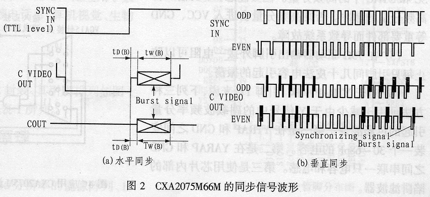 CXA2075M所需的行、場同步脈沖信號是通過10腳的SYNCIN輸入端引入復合同步信號分離產(chǎn)生的,其波形如圖2所示。