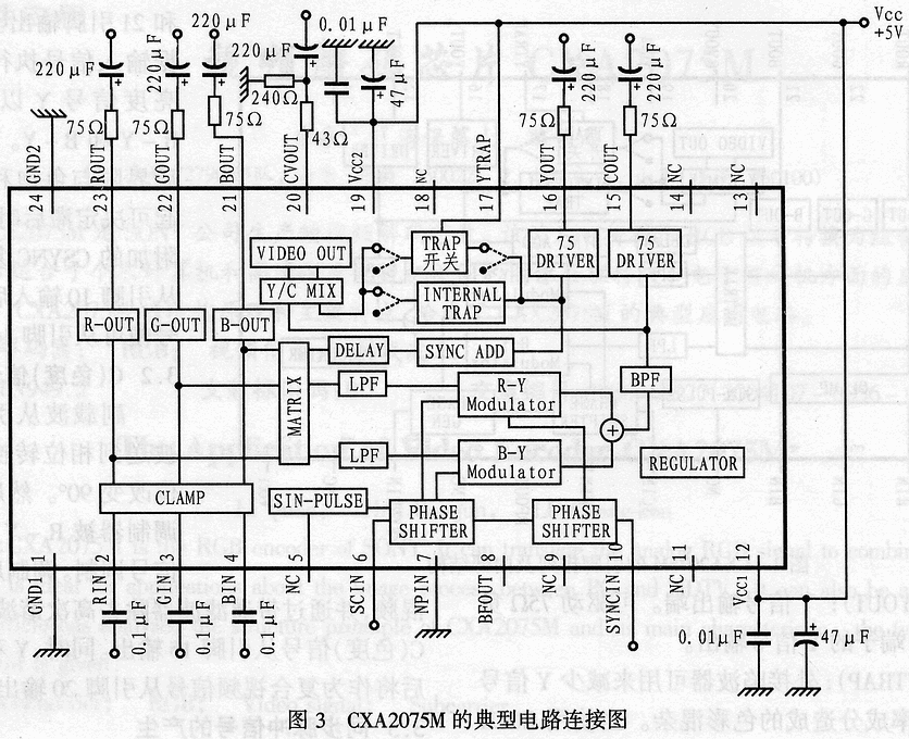 (6) 對于YTRAP引腳?引腳17?來說?下列三種方法可用于減少由于Y信號中的副載波頻率分量引起的色彩混雜?第一是在YTRAP和GND之間安裝一個30~68pF的電容。第二是在YARAP和GND之間串聯(lián)一只電容和電感。第三是使用芯片內(nèi)部的陷阱濾波器。