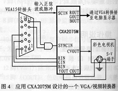 圖4是應用CXA2075M設計的一個VGA/視頻轉換器,圖中,左邊的VGA15針接頭可接在電腦主機顯卡的VGA接口上,輸出部分可以通過視頻端口或S端子與電視機相連接,同時本轉換器還可和電腦顯示器進行接口以實現(xiàn)同步顯示。