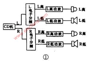 ??? 電子分頻器是將信號源傳送過來的微小音頻信號直接進入電子分頻器。由電子分頻將全頻帶(從低音到高音)的信號分成為高音和低音信號,分別傳送到相對應(yīng)的功放進行放大,然后再推動相對應(yīng)的揚聲器單元發(fā)出聲音見圖 1 。電子分頻是一個相對比較復(fù)雜,但重播效果良好的音樂重播系統(tǒng)。電子二分頻系統(tǒng)除分頻器外,還需要 4 個聲道的音頻功率放大器。電子三分頻系統(tǒng),需要 6 聲道的功放,而電子四分頻則需要 8 個獨立聲道的功放。電子分頻的優(yōu)點是重播音色好,各頻帶間的平衡調(diào)整簡便易行,但制作成本較高。