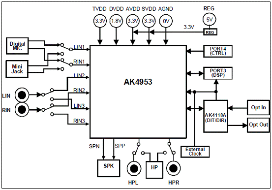 關(guān)鍵詞:AK4955 , AKM , Codec , 立體聲 , 錄音播放 AKM公司的 AK4955是集成了麥克風(fēng)放大器,揚(yáng)聲器放大器,視頻放大器,LCD和DSP的 24位立體聲CODEC,具有