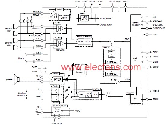 61 AKM公司的AK4687是具有兩路輸入選擇器和線(xiàn)路驅(qū)動(dòng)器的異步立體聲CODEC。AK4687的ADC/DAC接口能接收高達(dá)24位輸入數(shù)據(jù)并支持異步操作。前置放大器的輸入方位支持三通道立體聲輸入,可通過(guò)