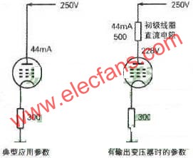 ????在電子管手冊中我們都能查到功放管的典型應(yīng)用參數(shù),一般都有屏極工作電壓這個參數(shù),例如6P1電子管的屏極電壓手冊上推薦為250V,有很多制作圖紙和發(fā)燒友在實(shí)際制作中都按照這個參數(shù)來選擇電源變壓器的交流輸出電壓,實(shí)際上這樣是不好的,并不能很好的發(fā)揮功放管的性能,因?yàn)樵谄良壔芈分写休敵鲎儔浩鳌]敵鲎儔浩鞯某跫壘€圈是有直流電阻的,當(dāng)靜態(tài)電流流過初級線圈時便會產(chǎn)生電壓降,這時加到電子管屏極的直流工作電壓就會降低,其它參數(shù)隨著屏極電壓的改變也相應(yīng)變化,我用下面的圖1和表2給大家說明。