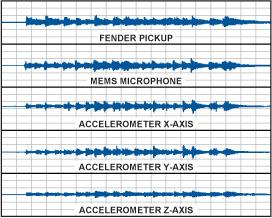 樂器中利用振動(dòng)感應(yīng)傳感器進(jìn)行拾音的概念也并非新概念。壓電和電磁傳感器是當(dāng)今許多聲學(xué)拾音應(yīng)用的基礎(chǔ)。由于微型的MEMS加速度計(jì)體積和質(zhì)量都很小,不會(huì)對(duì)樂器產(chǎn)生機(jī)械或質(zhì)量載荷方面的影響,從而在這些應(yīng)用中頗具