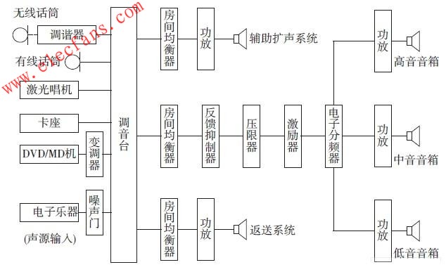 雖然擴(kuò)聲系統(tǒng)根據(jù)需要選取的設(shè)備和周邊設(shè)備不同,其品牌、功能、品質(zhì)也會(huì)有差異,但核心是一致的,即在達(dá)到擴(kuò)聲目的的前提下,保障還音的質(zhì)量。圖1給出了一個(gè)比較完善的擴(kuò)聲系統(tǒng)。
