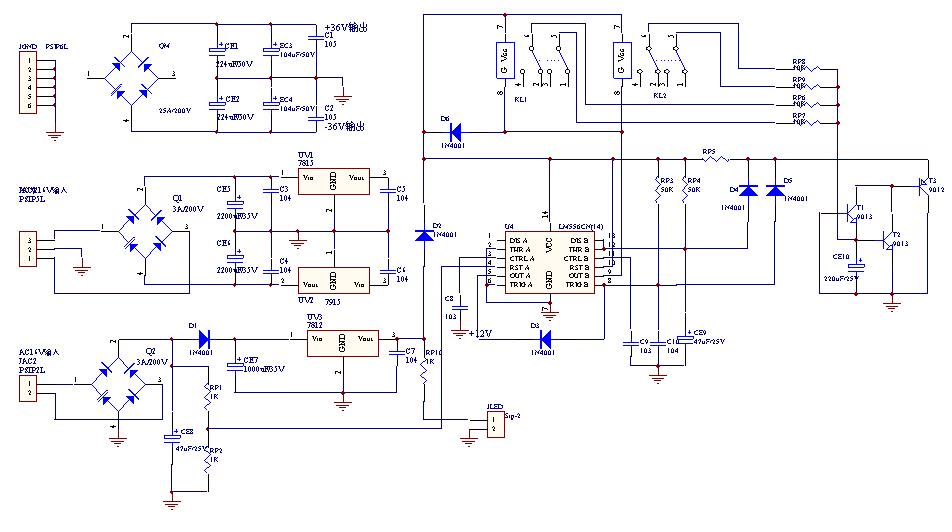 二.四通道功率放大器 與電子二分頻前級(jí)相配合,功率放大器部分由4