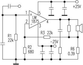 LM1875采用TO-220封裝結(jié)構(gòu),形如一只中功率管,體積小巧,外圍電路簡單,且輸出功率較大。該集成電路內(nèi)部設(shè)有過載過熱及感性負(fù)載反向電勢安全工作保護(hù)。