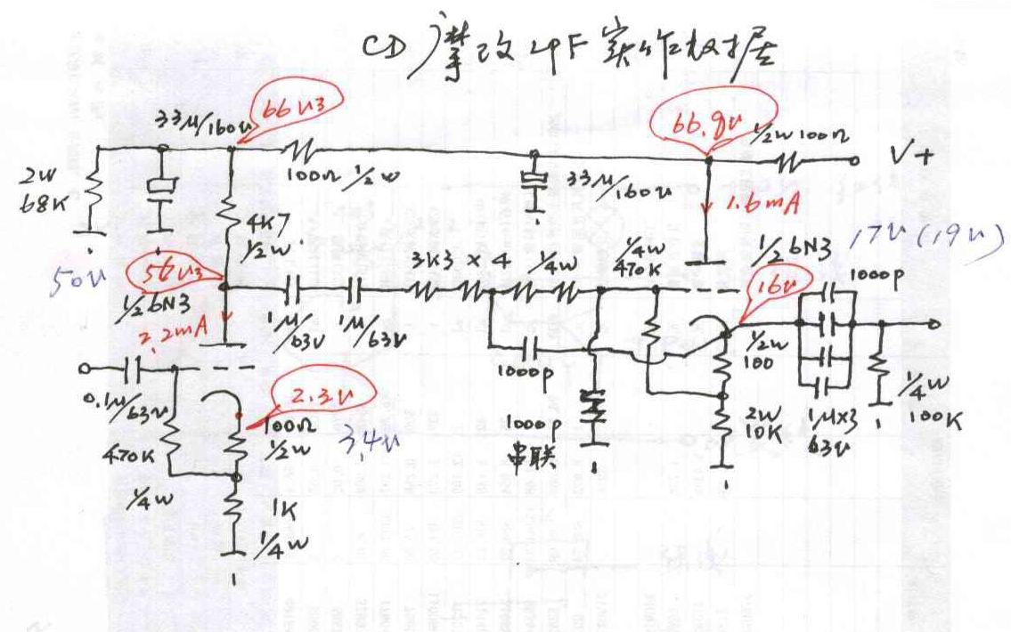 當(dāng)初“雨夜聽(tīng)”的樣機(jī)照片,能看的出,當(dāng)時(shí)他用的元件,尤其是第一級(jí)的管子是5670,不是國(guó)產(chǎn)的6N3。 看電路十分簡(jiǎn)潔,前面是一個(gè)6N3的共陰放大,采用的是陰極自給偏壓電路,實(shí)測(cè)這一級(jí)的工作電流