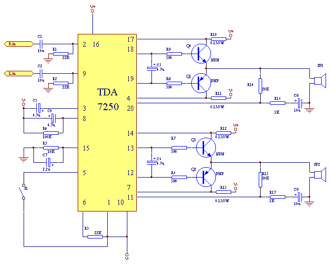 這種250瓦音頻放大器電路TDA7250 SGSThomson制造的音頻驅(qū)動(dòng)器,可以使用很少的外部電子部件設(shè)計(jì)出非常簡(jiǎn)單的大功率音頻放大器電子項(xiàng)目。