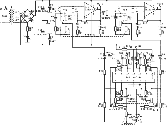 本立體聲功率放大器所用的核心芯片是國際通用高保真音頻功率放大集成電路TDA2030A。本電路由三 個部分組成,即電源電路、左右聲道的功率放大器及輸入信號處理電源(四運放)。電源變壓器將220V交流電降為雙12V低壓交流電,經(jīng)橋式整流后變?yōu)椤?8V的直流電,作為功放及運放的供電電源,D5、R29組成電源指示電路,以指示電源是否正常,開關(guān)K為電源開關(guān)。