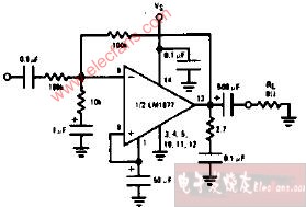 電阻RL。由輸入端100kΩ電阻與13腳與8腳之間反饋回路的100kΩ電阻的比值確定放大器的增益,因此放大器增益為1,即構(gòu)成反相單位增益放大器。與輸出端13腳并聯(lián)的2.7Ω電阻、0.1μF電容用于濾除高頻噪聲。