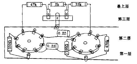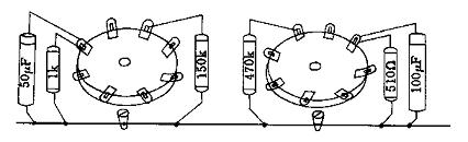 ??? 搭棚式接法一般將功放機內(nèi)的各種元器件分為3—4層,安裝元件的步驟是由下而上。接地線與燈絲走線一般置于靠近底板的最下層,其地線貼緊底板,并保持最好的接觸;第二層多為各電子管陰極與柵極接地的元器件。注意同一管子陰極與柵極的相關(guān)元件接地最好就近在同一點接地;第三層是各放大級之間的耦合電容等元件;最上層則為以高壓架空接法連接的阻容等元件。高壓元件置于上層可以有效地防止高壓電場對各級電路造成的干擾。