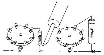??? 功放管屏極或柵極回路要串接的電阻,應(yīng)直接焊接在電子管座的屏極或柵極接線片上,如電子管座上無空腳架空,可在最近距離內(nèi)使用小支架,不宜再用較長導(dǎo)線相連接。圖8—9為管座自架空接法示意圖。?