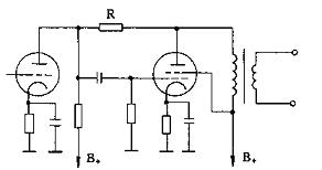 ??? 將后一級放大管屏極的信號,通過電阻R反饋到前一級電子管的屏極。因前級信號經(jīng)柵極倒相后,前級與后級兩管的屏極相位亦相反,這樣即組成屏至屏極的負反饋網(wǎng)絡(luò)。反饋電阻R的阻值—般取1—1.5MΩ。若R的阻值過小時,會降低輸入阻抗,同時對放大器的低頻響應(yīng)造成影響。