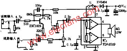 20W公共汽車收音機和擴音機電路采用TDA2005S雙低頻功率放大集成電路設(shè)計,前端輸入端可以接話筒或收音機的低頻電壓放大輸出級,每個TDA200S輸出10W功率,可帶4個揚聲器。兩路輸