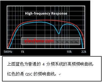 上圖藍(lán)色為普通的4分頻系統(tǒng)的高頻頻響曲線,紅色的是QSC的頻響曲線。
