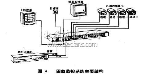 由圖4中可以看出,監(jiān)控系統(tǒng)是由多畫面處理器、攝像頭、監(jiān)視器、延時(shí)錄像機(jī)以及傳感器等部分組成的。多個(gè)攝像頭可以用于同時(shí)監(jiān)看多個(gè)場所,操作員可以遠(yuǎn)程控制云臺(tái)來調(diào)整每個(gè)攝像頭的位置以對(duì)準(zhǔn)所關(guān)心的目標(biāo)。根據(jù)實(shí)際需要,可以為系統(tǒng)配備不同數(shù)目的監(jiān)視器。例如普通的監(jiān)控系統(tǒng)一般都配備兩臺(tái)監(jiān)視器,主監(jiān)視器主要用來顯示多畫面,另外一臺(tái)則用來單獨(dú)監(jiān)看某一路圖像或者各路的順序切換圖像。對(duì)于某些極其重要的監(jiān)控點(diǎn)應(yīng)該專門配備一臺(tái)監(jiān)視器。延時(shí)錄像機(jī)是每個(gè)監(jiān)控系統(tǒng)必不可少的重要部分,其功能是每隔一定的時(shí)間在磁帶上記錄一段各路的圖像信號(hào),它所錄制的信息在很多時(shí)候能為案件的偵破提供重要的線索和證據(jù)。由于監(jiān)控系統(tǒng)一般都是24小時(shí)連續(xù)工作的,錄像機(jī)不可能記下每一時(shí)刻的圖像信息,所以一般都會(huì)根據(jù)實(shí)際情況調(diào)整延時(shí)錄像機(jī)的采樣間隔時(shí)間。大多數(shù)監(jiān)控系統(tǒng)都會(huì)配備報(bào)警傳感器,這些傳感器一般都安裝在監(jiān)控現(xiàn)場的某些敏感區(qū)域,如果現(xiàn)場出現(xiàn)例如火災(zāi)、特殊氣味等情況,傳感器就會(huì)立即給監(jiān)控中心發(fā)出報(bào)警信號(hào)。以上幾個(gè)部分都屬于監(jiān)控系統(tǒng)的外設(shè),不同的系統(tǒng)會(huì)根據(jù)實(shí)際需要進(jìn)行不同的配置,而多畫面處理器卻是所有監(jiān)控系統(tǒng)的核心。它相當(dāng)于整個(gè)系統(tǒng)的大腦,所有從外界進(jìn)來的圖像以及報(bào)警信息經(jīng)過多畫面處理器的加工后,才能變成有用的信息以供系統(tǒng)管理員觀察和處理。