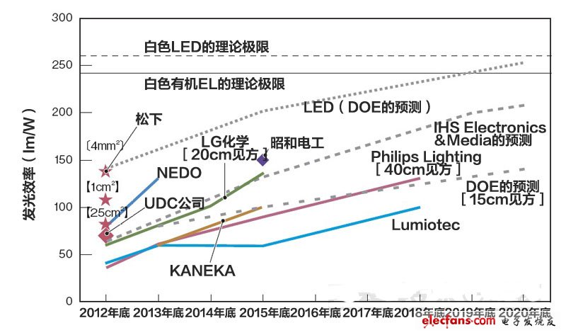 各廠商、研究機(jī)構(gòu)、美國能源部(DOE)及調(diào)查公司的有機(jī)EL照明面板發(fā)光效率發(fā)展藍(lán)圖。甚至有2020年將超過200lm/W的大膽預(yù)測。2012年的值為實(shí)際值。