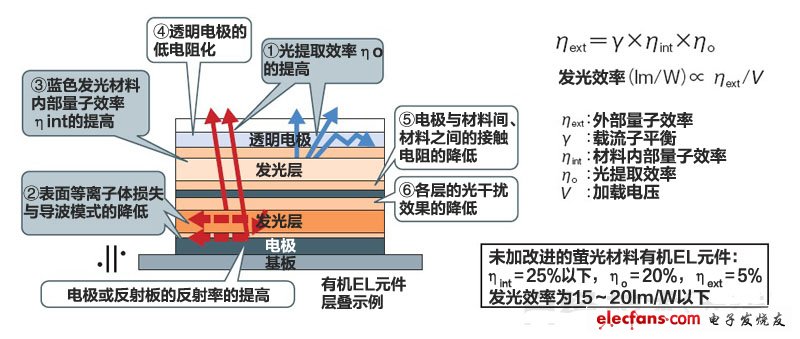 產(chǎn)品之所以與今后的目標(biāo)值有巨大差距,是因?yàn)樽罱〉昧送黄?,能使發(fā)光效率飛躍性提高(圖5)。尤其是以下3點(diǎn)取得了巨大進(jìn)展:(1)提高從光提取層的光提取效率、(2)通過抑制表面等離子體共振*而提高光提取效率、(3)提高藍(lán)色發(fā)光材料的效率。