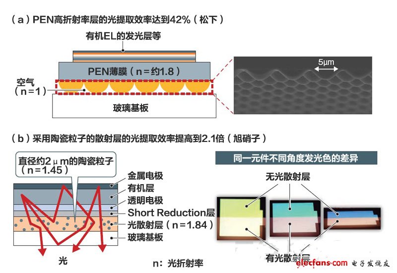 松下通過在有機(jī)EL元件的表面一側(cè)采用PEN薄膜將光提取效率提高到了約2倍,1cm見方元件的發(fā)光效率實(shí)現(xiàn)了101lm/W(a)。旭硝子通過在高折射率玻璃中添加陶瓷粒子使光散射,將光提取效率提高到2.1倍,同時還降低了對波長的依賴性。(圖和照片:a由松下,b由旭硝子提供)