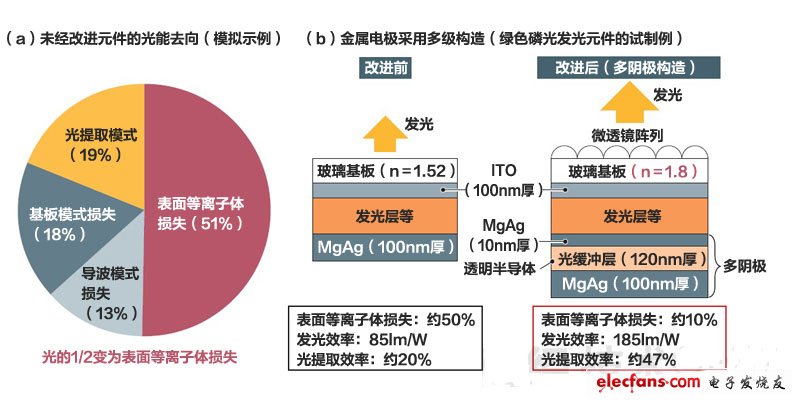 各廠商也開始針對元件陰極采取措施。例如,東芝在SID 2012上發(fā)布的發(fā)光效率為91lm/W的元件,沒有在元件正面一側(cè)設(shè)置特別的光提取層。而是將陰極材料由原來的鋁(Al)換成了其他高反射率材料?!安⒉荒苷f明效率的提高全靠反射率,表面等離子體損失的降低等或許也發(fā)揮了作用”(東芝)。