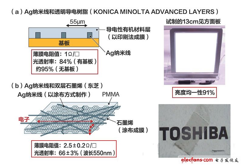 KONICA MINOLTA ADVANCED LAYERS將Ag納米線和導(dǎo)電性有機(jī)材料相結(jié)合,開發(fā)出了同時具備大型有機(jī)EL面板透明電極要求的低薄膜電阻和高光透射率的透明導(dǎo)電膜(a)。東芝也將Ag納米線和石墨烯相組合,開發(fā)出了低薄膜電阻值透明導(dǎo)電膜(b)。光透射率稍低。((b)圖攝影:東芝)