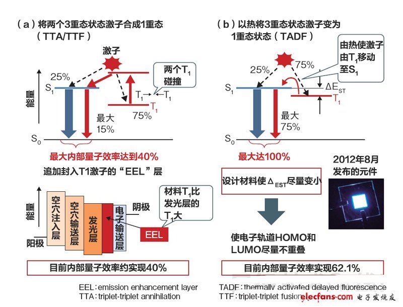 不過,新材料實(shí)際上是螢光發(fā)光材料。與以往的不同在于,具備將此前以熱等形式散失的能量用于螢光發(fā)光的機(jī)制。該機(jī)制主要有兩種。