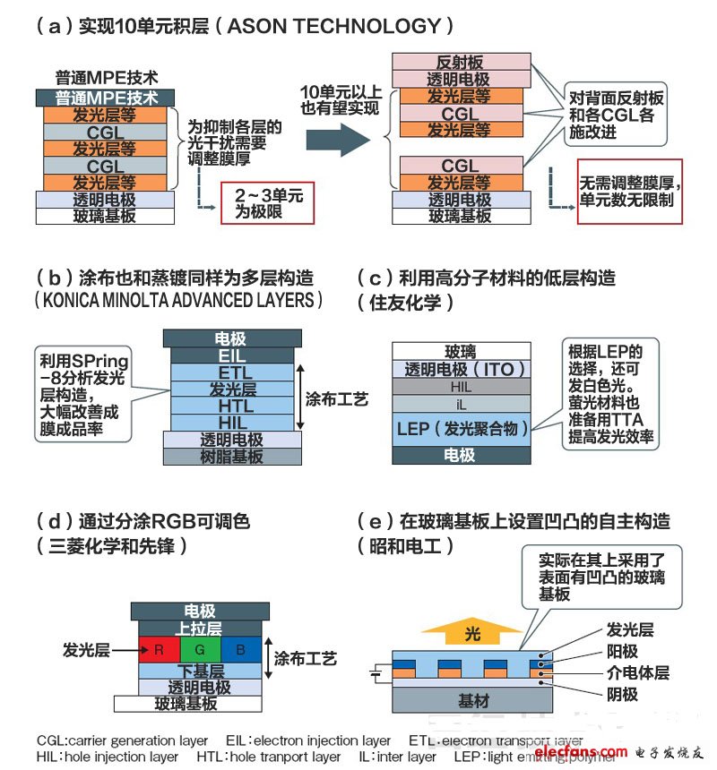 ASON TECHNOLOGY、KONICA MINOLTA ADVANCED LAYERS、住友化學(xué)、三菱化學(xué)和先鋒、昭和電工各自的元件構(gòu)造和特點(diǎn)。((e):昭和電工)
