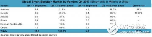 2017年Q4全球智能音箱制造商按廠商劃分(出貨量百萬(wàn)臺(tái))