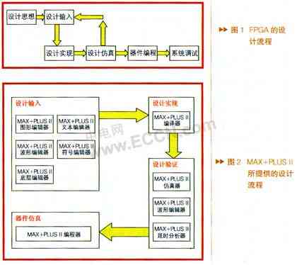 圖1表示FPGA的整個(gè)設(shè)計(jì)流程,從設(shè)計(jì)輸入到器件編程這四個(gè)階段可在MAX+PLUS II提供的環(huán)境完成。與圖1對(duì)應(yīng),圖2是MAX+PLUS II所提供的設(shè)計(jì)流程。