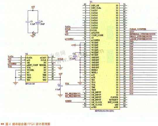 因?yàn)镋PF10K10是RAM型器件,設(shè)計(jì)程序需固化在外部串行自舉器件EPC2里,在上電時(shí),PF10K10把設(shè)計(jì)程序從EPC2讀入RAM并運(yùn)行。頻率綜合器的FPGA設(shè)計(jì)原理圖見(jiàn)圖4。