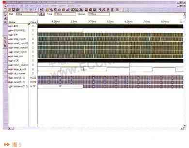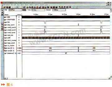 在MAX+PLUS II軟件開(kāi)發(fā)平臺(tái)上加以40MHz的激勵(lì)信號(hào),便可以驗(yàn)證設(shè)計(jì)正確與否,主要是通過(guò)波形文件來(lái)驗(yàn)證。波形文件見(jiàn)圖5、圖6。