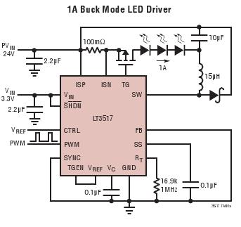 LT?3517 是一個具有內(nèi)部 1.5A、45V 開關(guān)的電流模式 DC/DC 轉(zhuǎn)換器,專為驅(qū)動 LED 而設(shè)計。LT3517 起一個 LED 驅(qū)動器的作用,可在升壓、降壓和降壓-升壓模式運作。它組合