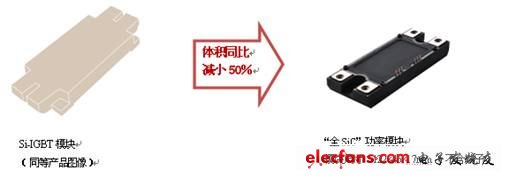 ●與傳統(tǒng)的400A級別的Si-IGBT模塊相替換時,體積減小約50%