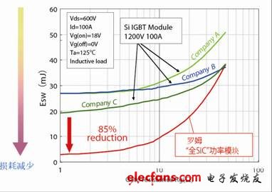 內(nèi)置了最先進的SiC-SBD與SiC-MOSFET的“全SiC”模塊,與傳統(tǒng)的Si-IGBT相比,開關損耗可降低85%。