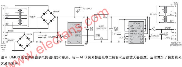 ????CMOS圖像傳感器屬于有源像素(有源像素傳感器,APS)(圖4),即光電二極管與后繼放大器,其噪聲水平與感光度堪與CCD轉(zhuǎn)換器相媲美。這種傳感器的缺點(diǎn)在于,放大器晶體管占據(jù)了過多的像素面積,光電二極管只有很小的空間可以利用。有源像素填充因子還受以下因素的制約:????