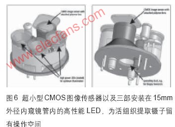 ????低成本、高分辨率的CMOS圖像傳感器BOCA可以與塑料透鏡一起提供100倍數(shù)碼變焦,同時(shí)取得120°視界。較遠(yuǎn)的結(jié)腸段可使用高性能發(fā)光二極管(LED)照明(圖6)。這些部件都安裝在指甲大小的結(jié)腸鏡頂端。結(jié)腸鏡內(nèi)還集成有供活組織提取鑷子使用的操作管,用于組織樣本提取。????