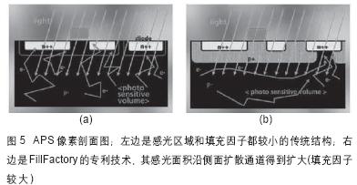 ????FillFactory[5]擁有的一項(xiàng)專利技術(shù)能夠?yàn)镃MOS-APS提供較高的填充因子數(shù)。與感光面積局限在二極管面積內(nèi)的傳統(tǒng)APS像素(圖5a)相反,F(xiàn)illFactory的方法能夠?qū)?biāo)準(zhǔn)CMOS加工芯片的大部分面積轉(zhuǎn)變?yōu)楦泄饷娣e(圖5b)。????
