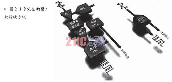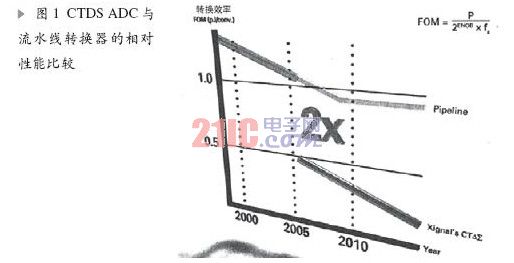 622 圖1示出CTDS ADC 與流水線轉(zhuǎn)換器相對(duì)性能比較,此圖是根據(jù)IEEE認(rèn)可的FOM(性能因數(shù))測(cè)量。FOM是每次轉(zhuǎn)換的能量量測(cè)。FOM也示出工藝結(jié)構(gòu)未來(lái)的標(biāo)度,連續(xù)時(shí)間Δ∑器件將沿給出較高性能水平的路線圖發(fā)展。