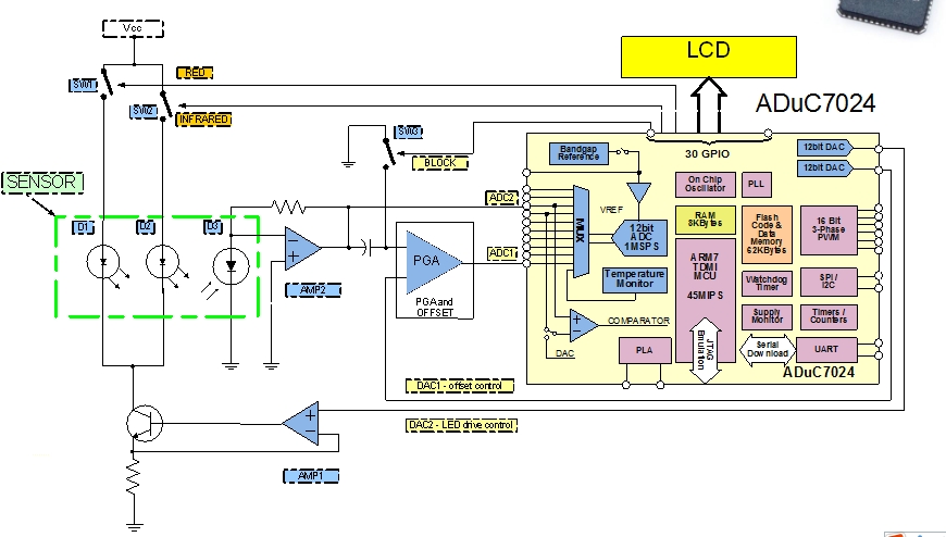 基于脈搏的PSoC,脈搏操作基于使用光傳感器測(cè)量穿過(guò)患者手指或耳垂的紅光和紅外光的吸收