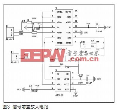 輸入保護(hù)電路主要是防止心電導(dǎo)聯(lián)輸入過高電壓損壞機(jī)器。輸出端最高最低不會超過±9V,接上二極管后保護(hù)電壓就為±9.7V,起到了低壓保護(hù)的作用。這樣兩極保護(hù)就確保電路中不會引入過高電壓,不會因過高電壓損壞心電圖機(jī)。