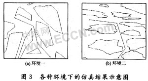 在算法的初始階段,由于轉(zhuǎn)向點(diǎn)較多,因此刪除概率應(yīng)當(dāng)取大一些,這樣可以使轉(zhuǎn)向點(diǎn)數(shù)量減少,從而縮小路徑的長(zhǎng)度;但在算法后期,路徑點(diǎn)已經(jīng)較少,再使用較大的刪除概率,容易使算法陷入局部解,且收斂到最優(yōu)解的概率大大減少,因此進(jìn)化后期的刪除概率應(yīng)減少,保證路徑的多樣性。初始刪除概率選0.8,大約20代以后,選取0.1,而擾動(dòng)算子1和插入算子1的概率始終為0.8。選取兩種不同的環(huán)境(見圖3),分別運(yùn)行上述算法各10次,選出效果最好的路徑顯示在圖3(a)、圖3(b)中。從圖3中可以看出,改進(jìn)后的遺傳算法對(duì)各種環(huán)境都有良好的適應(yīng)性。其中,圖3(a)的情況最簡(jiǎn)單,只用了19代就得到了最優(yōu)結(jié)果;圖3(b)進(jìn)化了36代后;收斂到最優(yōu)解。