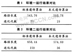 為了與標(biāo)準(zhǔn)遺傳算法的性能進(jìn)行對(duì)比,分別使用本文算法和標(biāo)準(zhǔn)遺傳算子對(duì)環(huán)境一和二進(jìn)行實(shí)驗(yàn)。標(biāo)準(zhǔn)遺傳算法的選擇采用錦標(biāo)賽選擇法,其交叉概率、變異概率與本文算法相同,運(yùn)行結(jié)果如表1和表2所示。