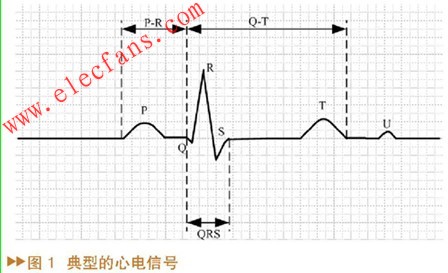 一個(gè)典型的心電信號(hào)如圖1示,它由P波、Q波、R波、S波和T波組成,在診斷過程中可以根據(jù)這些特征波的間隔幅值以及P-R間隔、S-T間隔和Q-T間隔判斷病人病情。