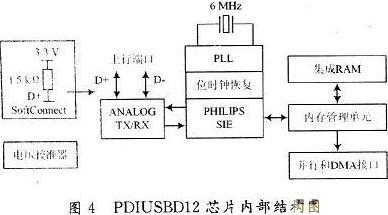 本系統(tǒng)設(shè)計采用了USB芯片PDIUSBD12與上位機進(jìn)行通信,PDIUSBD12是一個性能優(yōu)化的USB器件,通常用于基于微控制器的系統(tǒng)并與微控制器通過高速通用并行接口進(jìn)行通信,也支持本地DMA傳輸。該器件采用模塊化的方法實現(xiàn)一個USB接口,允許在眾多可用的微控制器中選擇最合適的作為系統(tǒng)微控制器,允許使用現(xiàn)存的體系結(jié)構(gòu)并使固件投資減到最小。這種靈活性減少了開發(fā)時間、風(fēng)險和成本,是開發(fā)低價、高效USB外圍設(shè)備解決方案的一種最快途徑。PDIUSBD12完全符合USB 1.1規(guī)范,也能適應(yīng)大多數(shù)設(shè)備類規(guī)范的設(shè)計,如成像類、大容量存儲類、通信類、打印類和人工輸入設(shè)備等,因此PDIUSBDl2非常適合做很多外圍設(shè)備。如打印機、掃描儀、外部大容量存儲器Zip驅(qū)動器和數(shù)碼相機等。現(xiàn)在用SCSI實現(xiàn)的很多設(shè)備,如果用USB來實現(xiàn)可以直接降低成本。PDIUSBDl2掛起時的低功耗以及LazyClock輸出符合ACPI,OnNOW和USB電源管理設(shè)備的要求。低功耗工作允許實現(xiàn)總線供電的外圍設(shè)備。PDIUSBD12還集成了像SoftConnect,GoodLink可編程時鐘輸出、低頻晶振和終端電阻等特性。所有這些特性都能在系統(tǒng)實現(xiàn)時節(jié)省成本,同時在外圍設(shè)備上很容易實現(xiàn)更高級的USB功能。PDIUSBD12芯片內(nèi)部結(jié)構(gòu)圖如圖4所示。