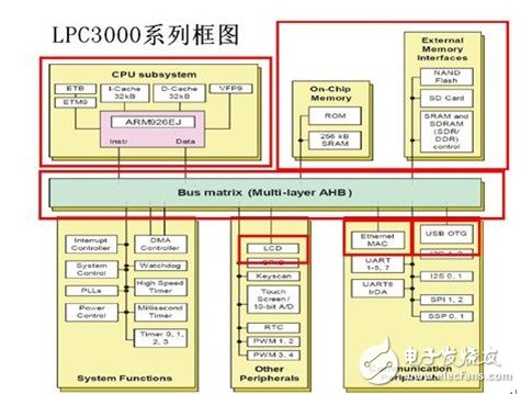 這類產(chǎn)品需要運(yùn)行操作系統(tǒng),如LINUX/WinCE等,需要復(fù)雜的顯示界面,進(jìn)行浮點(diǎn)運(yùn)算,連接多個(gè)外設(shè)模塊。LPC3250系列ARM9產(chǎn)品采用強(qiáng)大的ARM926EJ-S內(nèi)核,VFP協(xié)處理器,高效的內(nèi)部總線矩陣和大量的標(biāo)準(zhǔn)外設(shè)來(lái)實(shí)現(xiàn)超強(qiáng)的性能,LCD控制器能夠支持高達(dá)1024*768 TFT彩屏應(yīng)用,MMU單元支持操作系統(tǒng),多達(dá)7個(gè)UART可以方便的與多個(gè)檢測(cè)模塊互聯(lián),總線矩陣結(jié)構(gòu)保證多路數(shù)據(jù)流并行處理,下面是LPC3250具體參數(shù)與功能框圖: